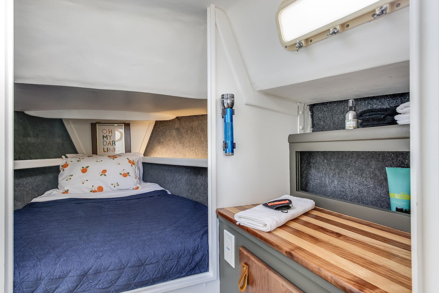 Aulneau, a former 1956 Canadian Coast Guard tugboat, has been transformed into a cozy floating apartment, ideal for a couple’s getaway. Located within walking distance of Downtown, Wickenden Street, Brown, and RISD, this unique stay blends nautical charm with modern comfort. Original bronze portholes and a ship’s helm complement fresh upholstery and custom cabinetry. The compact yet functional space includes a full kitchen with running water, a three-burner stove, and basic essentials. The small but cozy bedroom features a shorter-than-standard double bed, while heat and A/C ensure year-round comfort. Enjoy city views from the spacious aft deck or relax in the pilot house with morning coffee. Note: The boat has a composting toilet but no shower. Aulneau offers a true maritime experience for those who appreciate historic vessels! Check out this link to find more photos and availability of this vintage tugboat!
