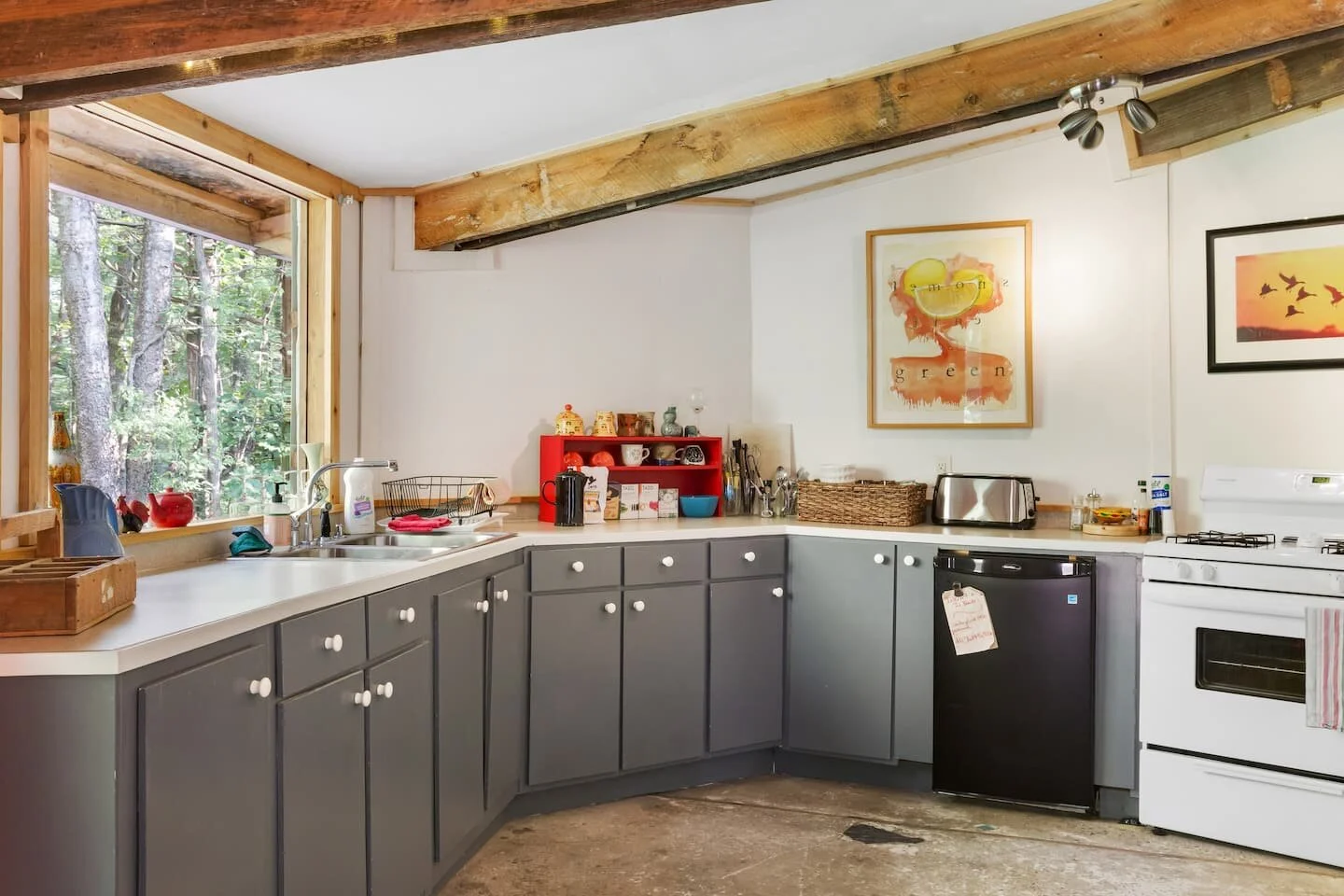 This glamping cabin off the grid in the North Carolina mountains is so romantic and cozy. We love how the large glass garage door rolls up to allow the daylight and fresh air inside. There is a deck with relaxing chairs, a grill, a hammock, a firepit, and even an off-grid shower and toilet. Truly use this experience to relax and escape from it all on this private 125 acre mountainside. After spending your day exploring the vibrant city of Asheville, or the amazing Blue Ridge Parkway, come back to this beauty to roast some s’mores. Also, dogs are allowed so bring your furry friend to explore the mountains! Check out this link to find more photos and availability of this off the grid cabin!
